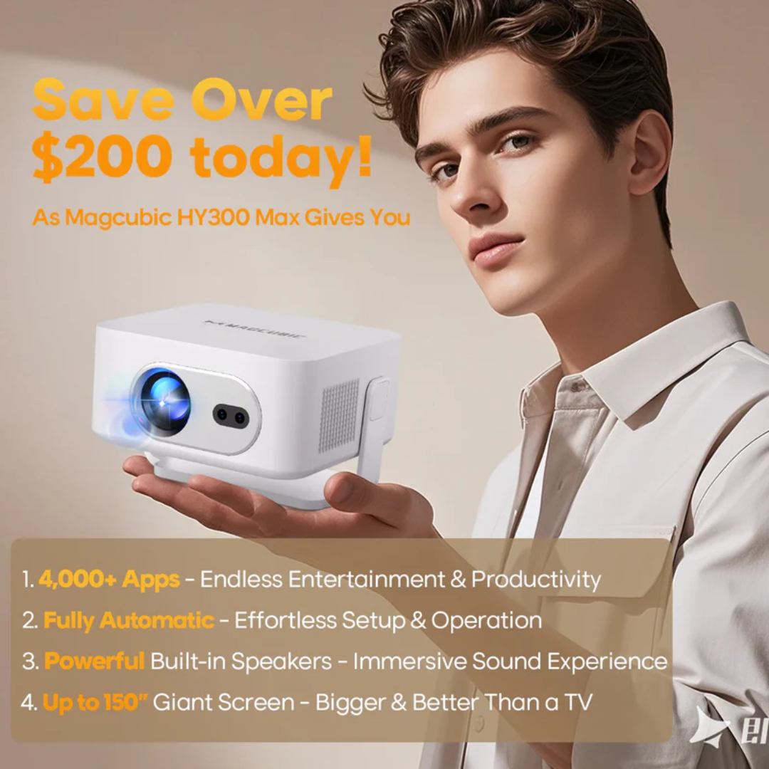 The Magcubic HY300 Max 260 ANSI 4K Android Auto Focus WiFi 6 Portable Projector is a premium portable projector designed for entertainment enthusiasts who demand professional-grade performance without compromising portability. With 260 ANSI lumens of brightness, this projector delivers exceptional image quality even in moderately lit environments, projecting crystal-clear visuals up to 150 inches diagonally.