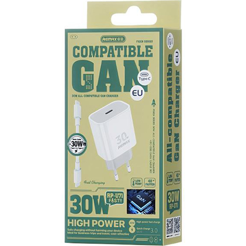 The first impression that catches the attention of users of the Remax RP-U71 30W QC and PD fast charger is its compact size, which does not take up space and is easy to hold when carried anywhere due to its ultra-lightweight design. The fast charger is made of high-quality PC+ABS plastic. This material has the ability to withstand high temperatures, shocks, impacts, and explosions effectively.